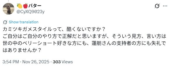 新藤が言ったのは「れんほ〜さんのようなベリーショート」ではありません。「れんほ〜さんのようなベリーショートのカミツキガメスタイル」です。100人が100人、誹謗中傷だと認識する発言です。それなのに「誰かのらしさスタイルを批判するものではありません」とかよくもまあ言えたものです。