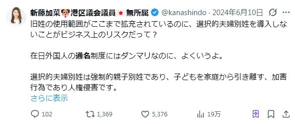 これだけでなく、新藤加菜はどういうわけか通名と夫婦別姓を結び付けます。
