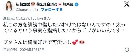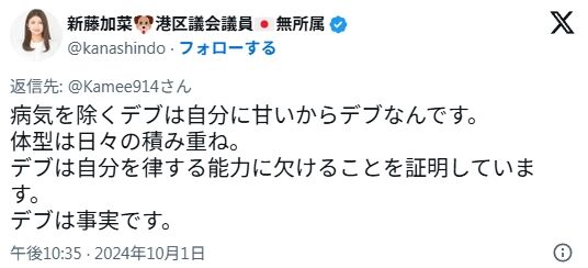 正常な判断力を持つまともな政治家であるならば、太っている人を「自己管理ができないクソ肥満野郎」などと決めつけるこんな酷い侮辱発言には苦言を呈することでしょう。しかし、新藤加菜にそんな常識的判断力など欠片ほどもあろうはずがありません! 逆にこれに乗っかるのです!!