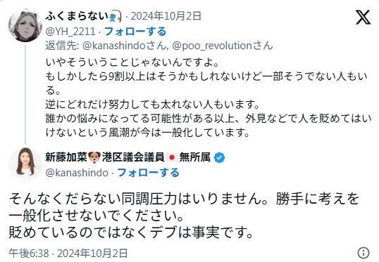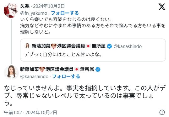 - 新藤加菜が、自分は他人に平然と「デブ」を繰り返し、「誹謗中傷じゃない、事実の指摘だ」と主張していること。