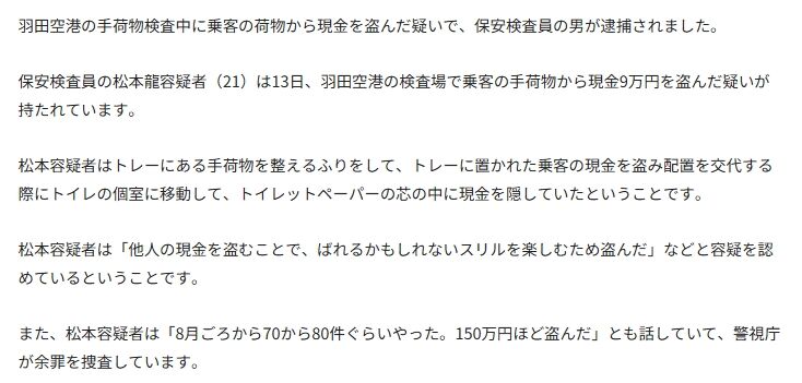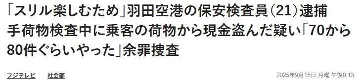 2025年9月15日、羽田空港で保安検査員が乗客の荷物から現金を盗んだ疑いで逮捕されました。