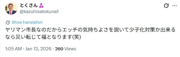 >>ヤリマン市長なのだからエッチの気持ちよさを説いて少子化対策か出来るなら災い転じて福となります(笑)