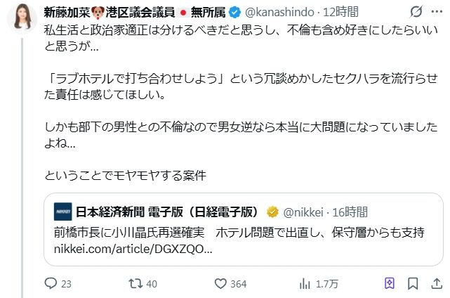 小川晶のことは私は詳しくないし、ホテルで異性と2人きりで打ち合わせするなんて非常識で、支持する気も擁護する気も毛頭ないのですが、それでも新藤加菜はひどい。妄想、デマ、差別、侮辱を交えないと気が済まないのでしょうか?