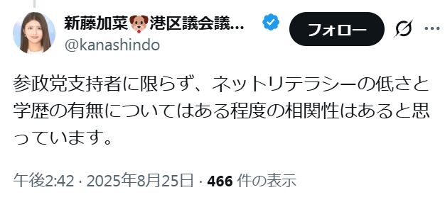 新藤加菜のような偏見にまみれ、批判されても反省もしない奴は、日本政界に絶対的に不要です。新藤のような存在は、政治への信頼を損なうだけです。二度とこういう人間が公人にならぬよう注意しましょう。