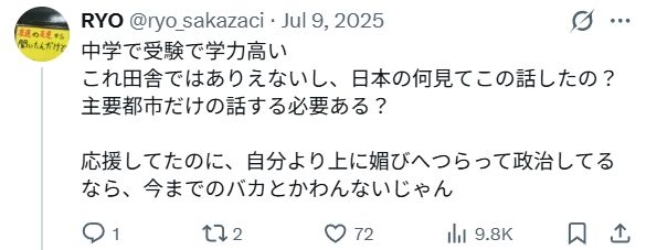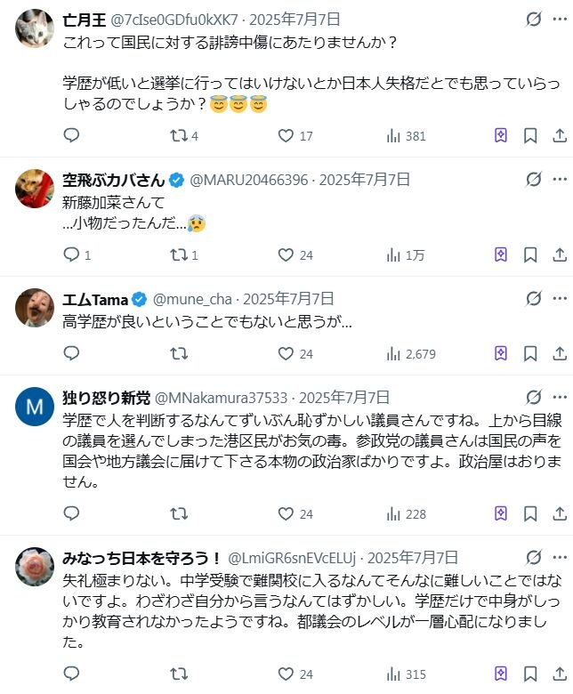 学歴と支持政党を結び付けたり、中学受験をしていない奴は基礎学力が低いとでも言わんばかりの新藤の発言は当たり前ながら大炎上。参政党支持者だけでなく、他の人たちからも批判殺到。