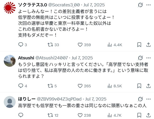 有権者の学歴を気にし、「支持者の足切り」までするという、とんでもなく思い上がった、偏見にまみれた差別主義者なのです。政治家としての自覚も資質も完全にゼロの最低最悪の政治家です。