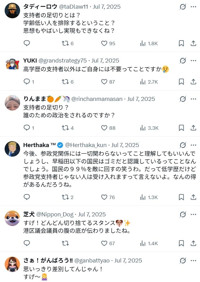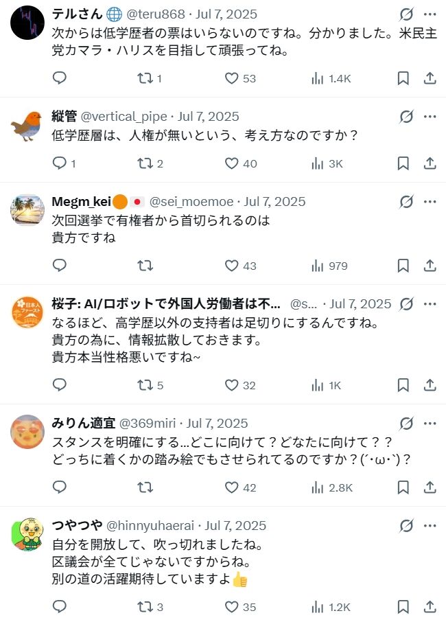 支持者の学歴が低いことを参政党批判の根拠の一つにしているわけですし、新藤は別件で「学歴がない人は趣旨が理解できずに自分の主張だけをするので分かり合えない」とまで発言しています。にわかには信じがたいことですが、やはりどう考えても、「学歴が低い人間の支持は要らない」と言っているとしか思えません。