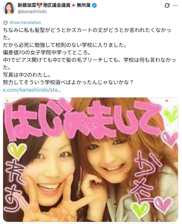 前回記事で見た通り、新藤は学歴は相手を判断する材料になると繰り返しています。そりゃあ、企業が採用の際に学歴を判断材料の一つにするのは分かりますよ。でも、新藤加菜は全体の奉仕者たる政治家です。全有権者、全国民の代表です。そこには、学歴が低い人も高い人も含まれており、そのすべての人たちのための政治を行わなければなりません。