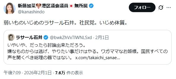↓日曜討論から逃げた高市を批判するラサール石井を「弱いものいじめ」と言う新藤加菜。自分は散々弱い立場の人を誹謗中傷しておいて、自分のお気に入りの総理大臣が批判されたら「弱い者いじめ」と言う。これほどダブスタ卑怯者は他に見たことがない。