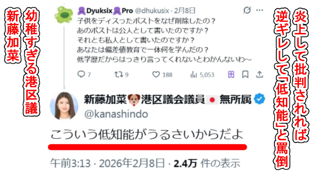 - 新藤加菜が、炎上して批判されたら、相手を「低知能」などと逆ギレして罵る人間であること。