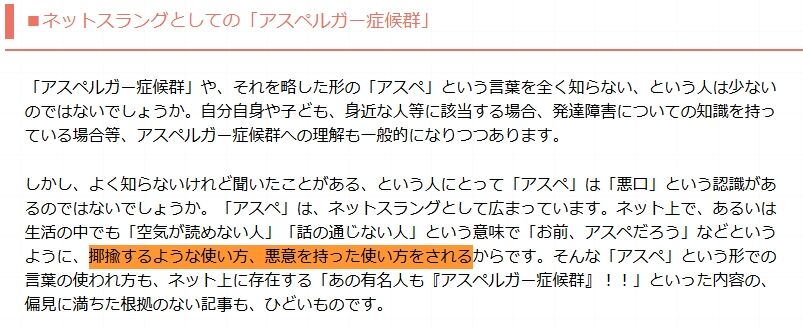 世の中には、このような「アスペ」という言葉に怒ると、「『アスペ』と呼ばれて怒るって、お前こそアスペルガーに対する差別意識があるからだ」とか言い返してくる奴がいますが、「アスペ」を嫌いな人間を放り込むゴミ箱にしているその侮蔑意識が問題なんですよね。