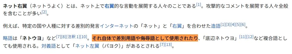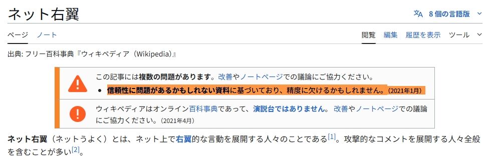 さらに、Wikipediaの「ネット右翼」の記事には、「信頼性に問題があるかもしれない資料に基づいており、精度に欠けるかもしれません。(2021年1月)」という警告文が貼られています。