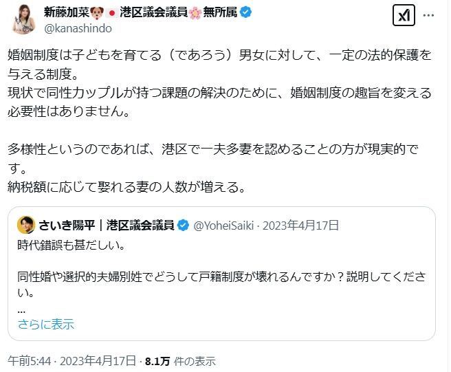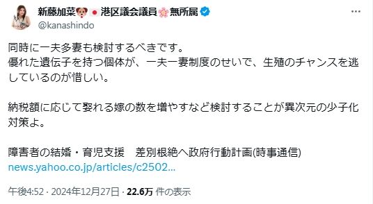 - 新藤加菜が、小川晶前橋市長を「部下の男性との不倫」したという不確実な情報を断定して発信する人間であること。