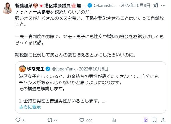 - 新藤加菜が、小川晶を「ヤリマン市長」と呼ぶセクハラ発言を否定するどころか乗っかる「下品な女」で「ゲロを吐くほど性格が悪い」人間であること。